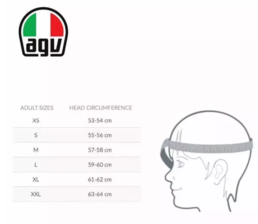 Pokiaľ vyberáte novú helmu a nie ste si úplne istí presnou veľkosťou, je potrebné si dôkladne premerať obvod hlavy a namerané hodnoty porovnať s tabuľkami veľkostí jednotlivých modelov heliem AGV.