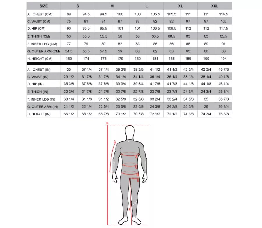 (cm)79-83 83-87 87-91 91–95 95–99 99-103 103–107 107-111 111–115 115–119 119–123 123–127 127-131 D. Stehno (cm) 48–49 50 - 51 52 - 53 54–55 56-57 58–59 60-61 62-63 64–65 66-67 68-69 70-71 72-73 E. Vnitřní šev (cm) 71-72 73-74 75-76 77-78 79-80 81-82 83-84 85-86 87-88 89-90 89-90 91-92 91-92 F. Vnější rameno (cm) 49–50 51-52 53–54 55–56 57-58 59 - 60 61-62 63-64 65-66 67-68 67-68 69-70 69-70 G. Výška (cm) 150–156 157-163 164–167 168-171 172–175 176–179 180–183 184–187 188–191 192–195 192–195 196–199 196–199 Pánske velikosti bot ALPINESTARS