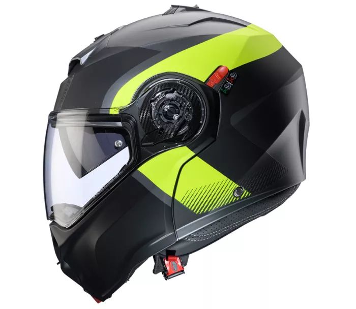 - P/J duálna homologácia pre otvorenú aj integrálnu helmu garantujúca bezpečnú jazdu so zaistenou otvorenou bradovou časťou - vďaka P/J páčke na ľavej strane helmy je možné pozíciu otvorenej bradovej časti zamknúť (pozícia "J") a tým blokovať možnosť jej samovoľného zatvorenia za jazdy