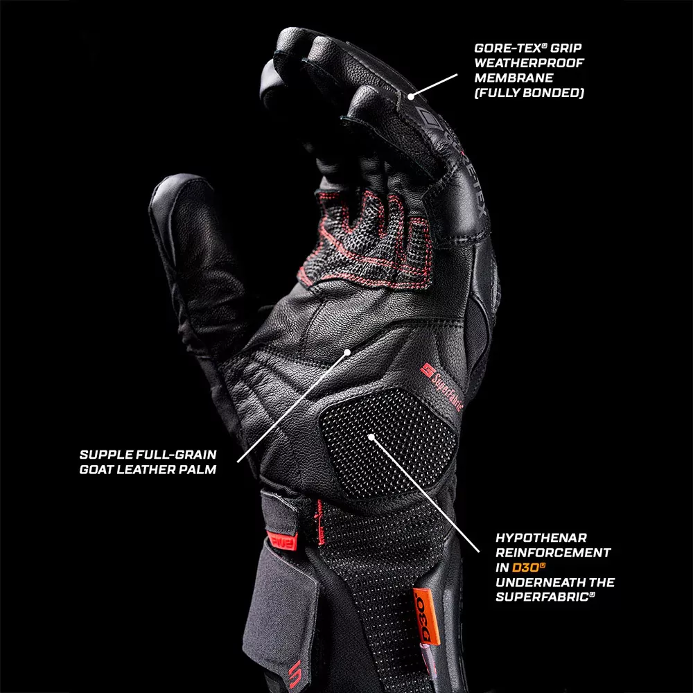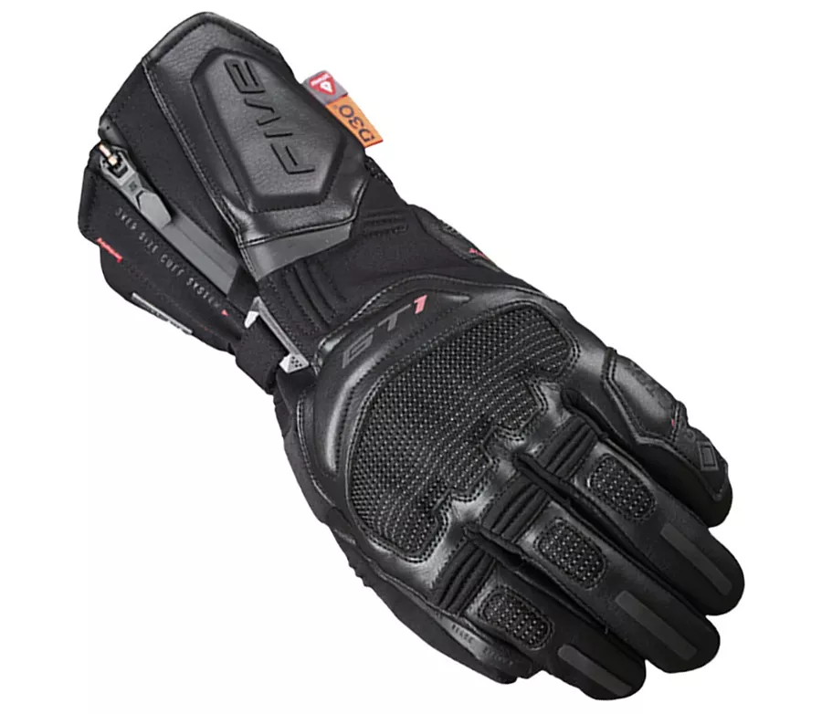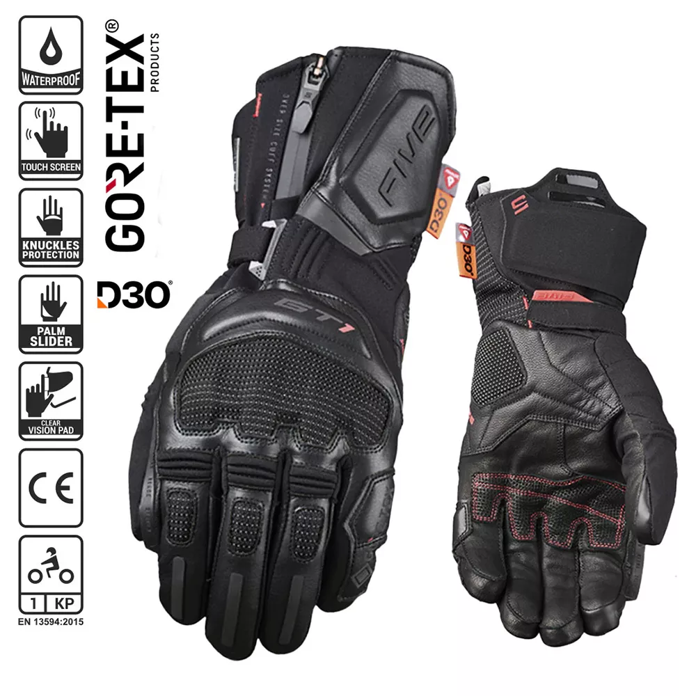 Dokonalé cestovné motocyklové rukavice, ktoré ponúkajú všetko, čo na jazdu potrebujete. Pružná koža a konštrukcia Syntech Skin™, membrána Gore-Tex® Grip™ a ľahká tepelná izolácia Primaloft® 80g poskytujú úplné pohodlie. GT1 EVO GTX taktiež obsahuje ochranné prvky FIVE ERGO PROTECH® – vyrobené z nárazuvzdorného materiálu D3O® – a ergonomický stierač. FIVE posunuli svoju inováciu ešte o krok ďalej a vytvorili tieto inovatívne cestovné rukavice Gore-Tex®, ktoré nebudete chcieť zložiť. - Vrchná konštrukcia zo Syntech Skin™ a strečového nylonu - Dlaň z mäkkej kozej kože - Prsty z elastického polyesteru s pohodlným stretchom s vonkajším prešitím prstov - Priedušná nepremokavá membrána Gore-Tex® Grip spojená s podšívkou dlane - Vodeodolná tepelná izolácia Primaloft® 80g Gold Cross Core Aerogel na chrbte ruky - Výstuha Syntech Skin® na malíčku - Jednodielna ochranná škrupina ERGO PROTECH® z materiálu D30® - Výstuha hypothenaru v D30 (posuvník dlane) - Systém oversize manžiet: nastaviteľný na uchytenie cez rukávy bundy, vrátane vodotesného zipsu YKK a zapínanie na suchý zips VELCRO® na zápästí a manžetách - Konštrukcia vrchnej časti je vybavená reflexnými nášivkami a reflexnými látkami - Systém Touch Screen™ na ukazováku a palci - Digitálne potlačená výstuha dlane z kozej kože pre optimálny úchop - Ergonomická stierka na ľavej strane - CE KP1