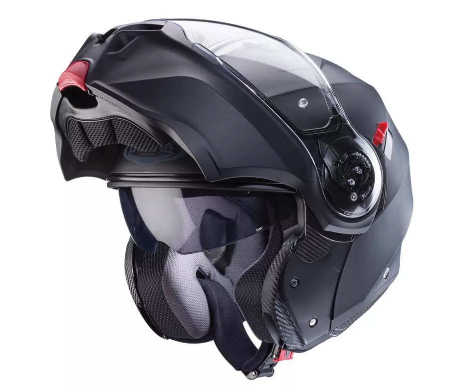 DUKE EVO je evolúciou ikonickej vyklápacej helmy Caberg DUKE, ktorá bola uvedená na trh v roku 2012 a ktorá zaznamenala medzi motocyklistami po celom svete veľký úspech. Predovšetkým pre svoju vynikajúcu službu za rozumné peniaze, kompaktné rozmery a hmotnosť, vysoké bezpečnostné štandardy a 5 hviezdičiek podľa testu SHARP. Úplne nová helma DUKE EVO spĺňa vysoké bezpečnostné nároky stanovené najnovším nariadením EU ECE 22.06. Z nepreberného množstva skvelých vlastností uvedieme náhodne: Kompaktné rozmery škrupiny a jej váha okolo 1600g, komfortná výstelka vyrobená z priedušných hypoalergénnych tkanín, nový systém vyklápania bradovej časti, vylepšená ventilácia, nový systém mechanizmu plexi. DUKE EVO sa vyznačuje agresívnym a podmanivým dizajnom, ktorý je ideálny pre touringových jazdcov, jazdcov na naháčoch a maxi skútroch. Po splnení požiadaviek stanovených skúšobným nariadením EÚ ECE 22.06 pre celotvárové (P) aj otvorené (J) helmy DUKE EVO získal dvojitú homologáciu P/J. Umožňuje teda jazdu aj s otvorenou bradovou časťou. Helma je vybavená systémom Double Visor Tech, ktorý vám vďaka integrovanej slnečnej clone umožňuje jazdiť bezpečne aj za ostrejšieho slnečného svitu. Slnečná clona je ošetrená technológiou proti poškriabaniu, číre plexi je vybavené protihmlievacou fóliou Pinlock Max Vision. Ďalej helma môže byť vybavená bezdrôtovým komunikačným systémom Caberg PRO Speak EVO, alebo iným na trhu dostupným komunikátrom. PRO Speak EVO umožňuje komunikovať nielen s vašim vlastným mobilným telefónom a vašim spolujazdcom, ale taktiež sa pripojiť k systému GPS, počúvať hudbu cez mobil alebo MP3 prehrávač. PRO Speak EVO je vybavený Bluetooth A2DP, ktorý umožňuje počúvanie stereo vo vysokej kvalite. Helma je homologovaná aj na použitie komunikátora. DUKE Evo sa vyrába v Taliansku. - škrupina tvrdený plast (ABS) - číre plexi + slnečná clona - systém rýchleho otvorenia plexi - plexi s úpravou proti poškriabaniu - Pinlock 70 súčasťou balenia - mikrometrická pracka - systém vnútornej cirkulácie vzduchu - ventilácia na brade a vrchnej časti helmy umožňuje prúdenie čerstvého vzduchu cez vzduchové kanáliky vo vnútri helmy a vytláča teplý vzduch z helmy von cez zadné otvory ventilácie - odnímateľná a prateľná hypoalergénna výstelka - plexi je vybavené gumičkou, ktorá zaisťuje ochranu pred pretečením vody - odnímateľná zarážka proti vetru - pripravené pre Caberg PRO Speak EVO komunikátor - pripravené na použitie interkomu - hmotnosť 1600 gr. +/- 50 gr. - P/J duálna homologácia pre otvorenú aj integrálnu helmu garantujúca bezpečnú jazdu so zaistenou otvorenou bradovou časťou - vďaka P/J páčke na ľavej strane helmy je možné pozíciu otvorenej bradovej časti zamknúť (pozícia "J") a tým blokovať možnosť jej samovoľného zatvorenia za jazdy - homologované podľa ECE 22.06 - vyrobené v Taliansku