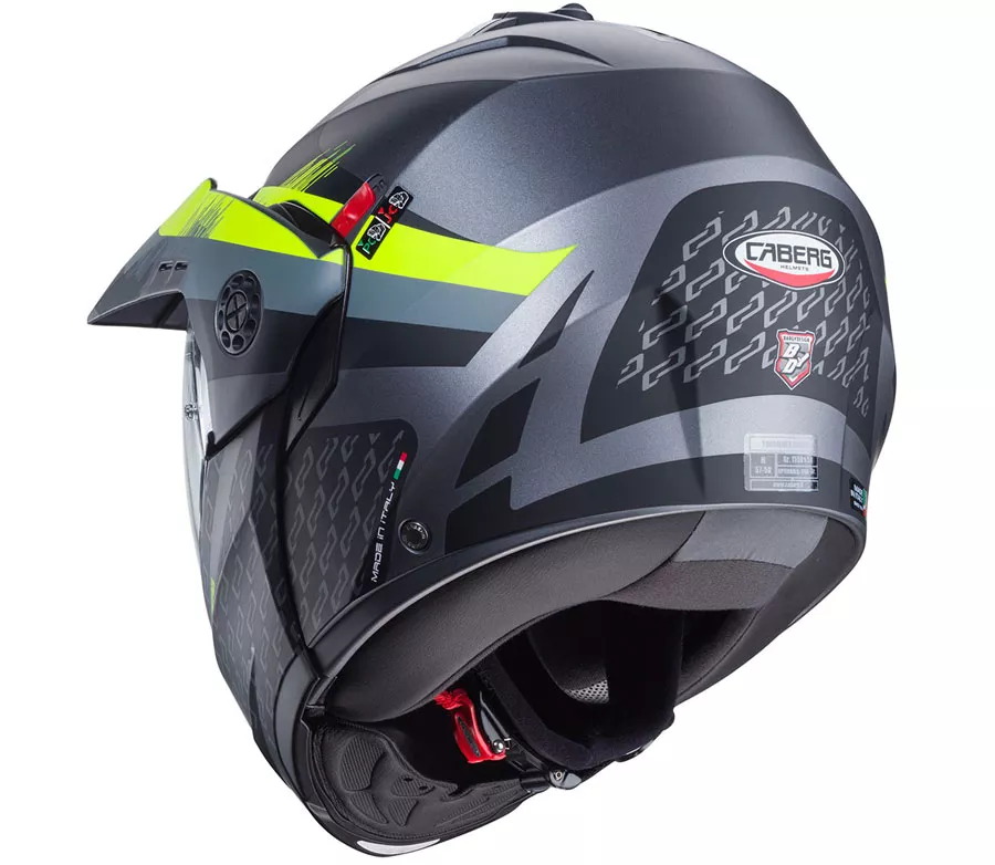 TOURMAX X prichádza s duálnou homologáciou P/J, ktorá umožňuje jazdu s otvoreným chráničom brady. Vďaka zámku výklopnej časti je možná aretácia bradovej časti v polohe „J“ (vyklopená). Táto páčka bráni nechcenému zatvoreniu bradovej časti počas jazdy.