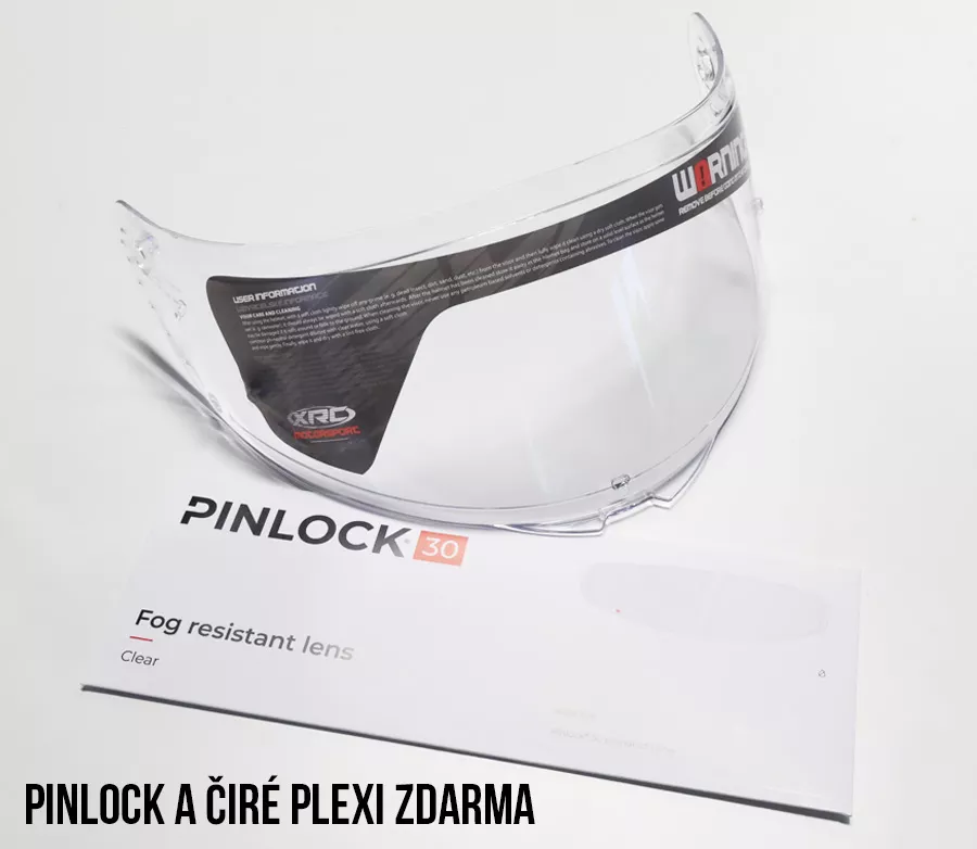 Súčasťou balenia je Pinlock 30, ktorý sa postará o vaše potreby. Kromě čirého plexi s úpravou proti poškriabaniu je súčasťou a druhé zatmavené plexi, ktoré sa bude posudzovať v budúcnosti. Ide o komfort a bezpečnosť, ako aj o bezpečnostnú výbavu a spojlery.