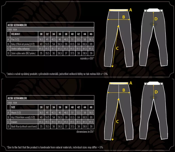 Tieto džínsy sú nutnosťou pre všetkých vyznávačov vintage štýlu a najmä pre fanúšikov Scrambler. Retro vzhľad docielený pomocou pracieho procesu vytvára autentickej oblečenie pre vintage jazdca. Nielenže vám tieto džínsy zaistí perfektný vzhľad, ale aj absolútne pohodlie a podstatnú mieru bezpečnosti. Tieto džínsy v strihu slim-straight vám bezpochyby skvele padnú, pretože sú vyrobené z elastického denimu. Funkčné a dobre vyzerajúci strečové panely nad kolenami, v rozkroku a zadnej časti pásu podporujú celkový komfort. Oderuvzdorná podšívka z materiálu Kevlar®, vyrobená progresívnou technológiou DuPont ™ v oblastiach kolien a zadnej časti stehien, vás v prípade potreby ochráni proti odreniu. Vyberateľné chrániče, ktoré spĺňajú úroveň CE level 2 na kolenách a bokoch, sú dodávané ako štandardné príslušenstvo. Poskytujú účinnú ochranu pri náraze. Pri výrobe džínsov Acid Scrambler sa používajú iba vysoko kvalitné komponenty. Kovové zipsy YKK a originálny materiál Kevlar® od spoločnosti DuPont ™. Keď jazdíte v teplých letných dňoch, nenápadné vetracie vrecká na stehnách zaistí potrebný prísun čerstvého vzduchu vždy, keď ho potrebujete. Vyvýšený pas zakryje spodnú časť vášho chrbta. Bočné vrecká na suchý sa hodí pre uloženie nevyhnutnosťou. MATERIÁL vonkajší materiál: elastický denim 11,5 oz, 98% bavlna, 2% elastan podšívka: aramidové vlákna v oblasti kolien a zadnej strany stehien z materiálu Kevlar® vyrobeného progresívnou technológiou DuPont ™ BEZPEČNOSŤ chrániče CE Level 2 na kolenách a bokoch CE Certifikováno dle EN 17092-3:2020, level AA ERGONOMICKÉ VLASTNOSTI 4 štandardné vrecká a dve bočné vrecká na suchý zips strečové panely nad kolenami, v páse a rozkroku nastaviteľná výška kolenných chráničov dvojitá pútka vpredu vyvýšený pas VENTILÁCIA vetracie vrecká na stehnách priedušný panel v rozkroku