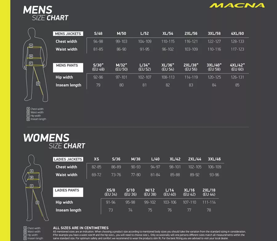 Pokud vybíráte nové oblečení MACNA a nejste si úplně jisti přesnou velikostí, je potřeba se důkladně přeměřit a naměřené hodnoty porovnat s tabulkami velikostí.