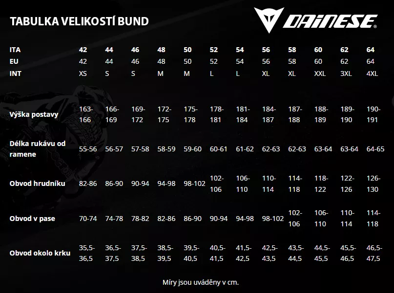 Pánské velikosti bund DAINESEVelikost Euro 42 44 46 48 50 52 54 56 58 60 62 64 USA velikost 32 34 36 38 40 42 44 46 48 50 52 54 C. Hrudník (cm) 82-86 86-90 90–94 94-98 98-102 102-106 106-110 110–114 114–118 118–122 122–126 126–130 Pas