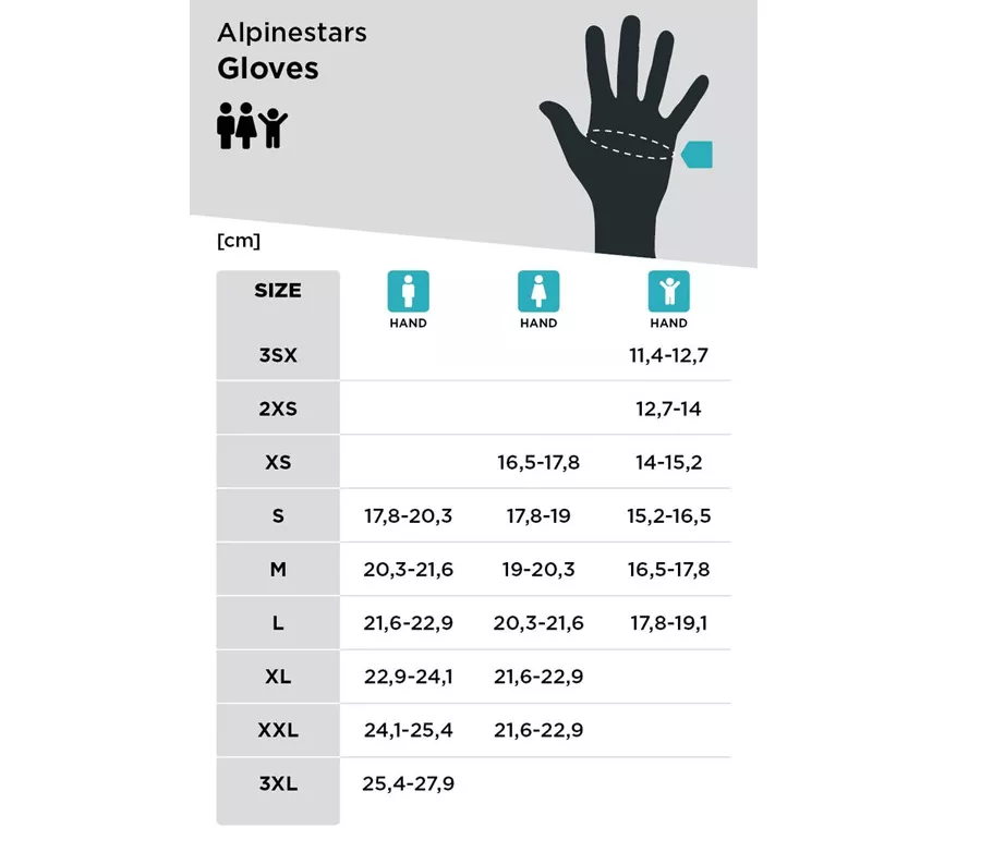 Rukavice ALPINESTARSVelikost (v cm) XS S M L XL Pánské 17,8-20,3 20,3-21,6 21,6-22,9 22,9-24,1 Dámské 16,5-17,8 17,8-19 19-20,3 20,3-21,6 21,6-22,9 Chrániče zad ALPINESTARS